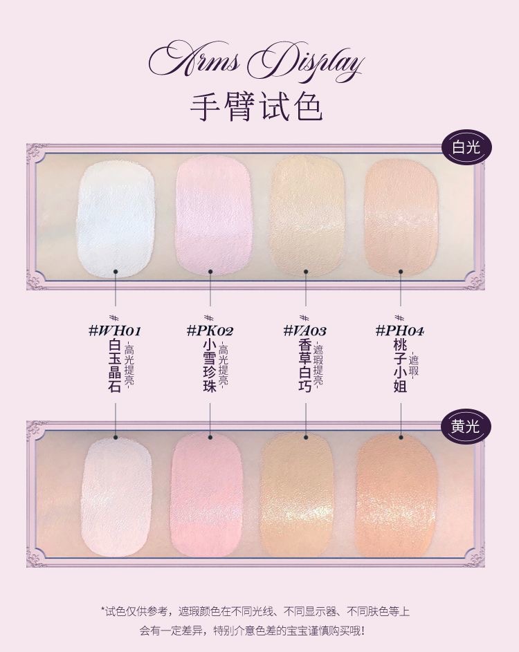 WH01白玉晶石:纯白提亮,水润奶霜质地 PK02小雪珍珠:矫正肤色,提亮泪沟法令纹